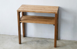 天板は木目を残しつつグレーがかって見えるように特殊な加工をしています。 *無塗装状態では赤または黄色味がかった木目です。 木の素材感を残したままのマットな質感で、使い込むことで傷や汚れ、こすれなどがついていき古材のような雰囲気に変化していきます。