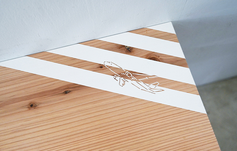 航空関係のお仕事とのことで、ストライプの中にさりげなく飛行機のグラフィックを入れ、ポップな雰囲気の机に仕上げてみました。