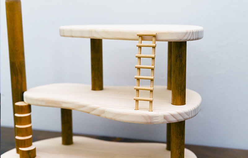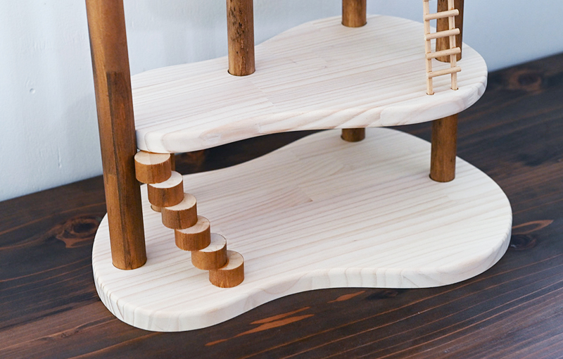 柔らかい曲線の土台に、柱や小さなハシゴ、丸いステップの階段など、すべて木製です。